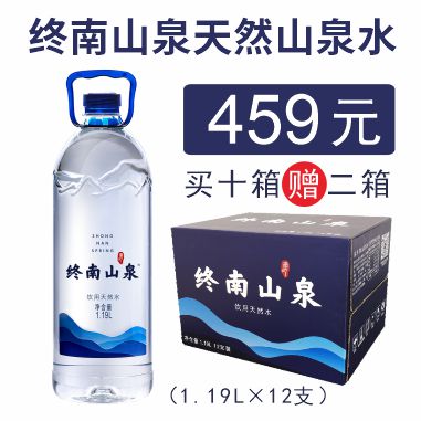 终南山泉天然瓶装水: 终南山泉1.19Lx12支(箱装)10箱 45.9元/箱 合计:459元 赠: 终南山泉1.19Lx12支(箱装) 2箱 合计:91.8元 总计:550.8元 套餐优惠价:459元(38.25元/箱)。